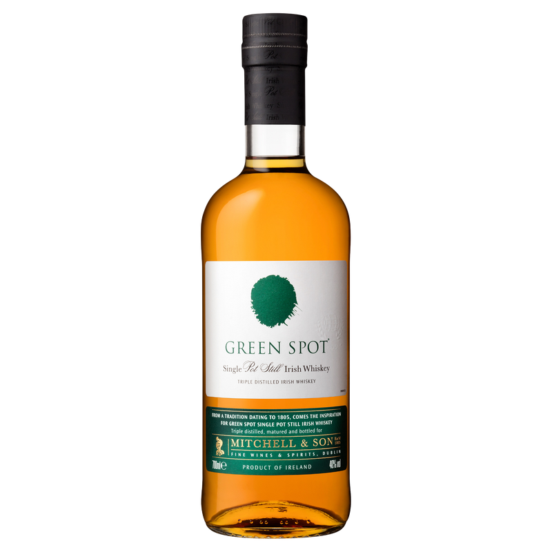 Green Spot Irish Whiskey is a classic single pot still Irish whiskey distilled in Midleton, County Cork, and matured in a combination of wine, sherry, and port casks. Named after the historic practice of marking aging barrels with a spot of paint to indicate maturity, it is crafted from a blend of whiskies aged on average 7-9 years. The nose offers fresh aromatic oils, spices, orchard fruits, and barley over toasted wood. The palate is full and spicy with hints of clove and the sweet freshness of green apples, leading to a lingering finish of warm spices, toasted oak, and barley.
